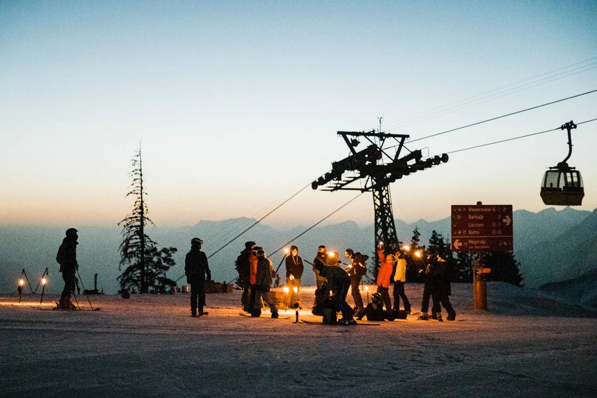 Fackelabfahrt - Ein echtes Highlight der Ecole-Erfahrung. Die ganze Schule versammelt sich zu einem besonderen Abendessen und anschließend zu einer von Fackeln begleiteten, sternbeleuchteten Abfahrt auf dem Skiberg.